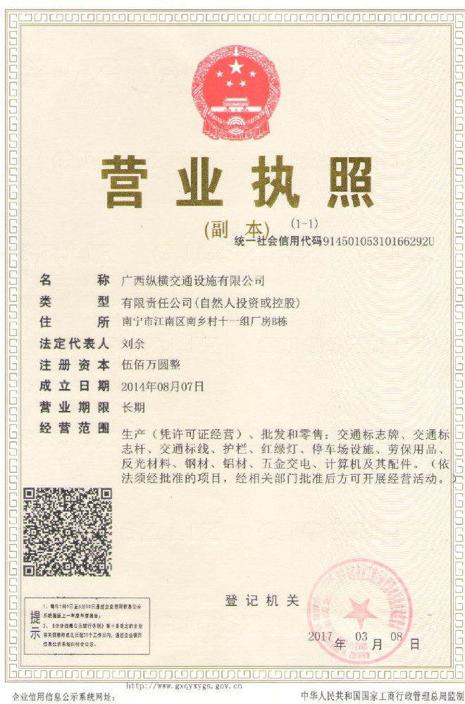南寧市縱橫交通設(shè)施有限公司 變更為 廣西縱橫交通設(shè)施有限公司。